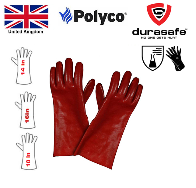 The Polyco Polychem red PVC chemical resistant gauntlet is a red PVC chemical resistant gauntlet with cotton interlock knitted liner.