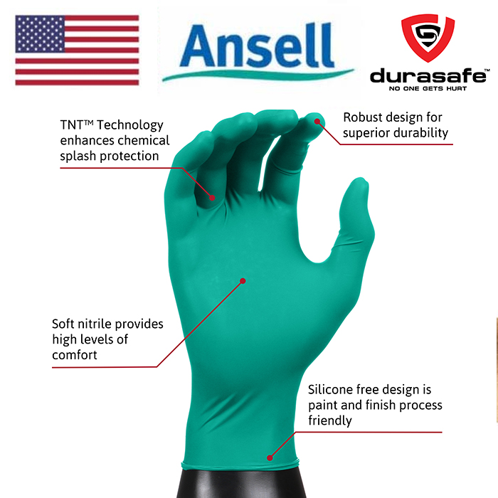 Disposable gloves are sometimes uncomfortable, but TouchNTuff 92-600 gloves are renowned for their superior comfort and durability. These best-selling teal green nitrile gloves from TouchNTuff are the world’s leading disposable gloves for chemical splash protection. Made with TNT Technology, a proprietary Ansell material formulation, TouchNTuff 92-600 gloves offer superior splash resistance against a wide range of hazardous chemicals. Their thick, 5 mil design makes them robust enough to offer superior durability. And because they’re made with a soft, elastic nitrile and are double chlorinated, these 5 mil nitrile gloves have a smooth, comfortable feel.