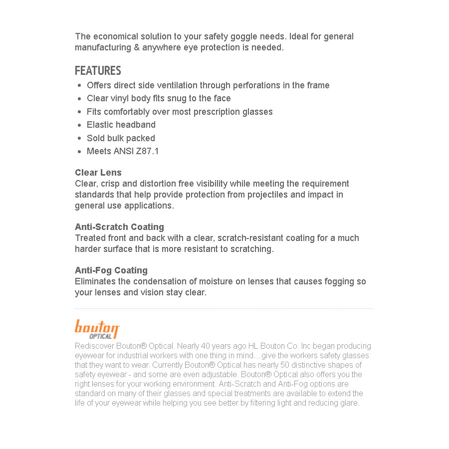 If you need an affordable goggle to please and protect your workers, try these Basic. The soft, vinyl body molds comfortably to the face and has a soft, elastic headband. Ventilation options include an indirect vented style with plastic hooded vents that provide indirect airflow while protecting the wearer from liquid splash and a directly vented model with side air vents to achieve airflow and gurad against dust, flying chips, and particles. Both come with impact resistant and fogless polycarbonate lenses.