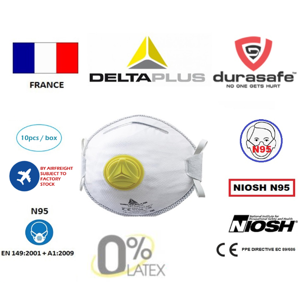 Box of 10 non woven synthetic fibre disposable masks FFP2. Moulded mask. Nose clip for adjustment. Foam edge under nose clip. High performance exhalation valve. DOLOMIA optional test for longer continuous wear time.