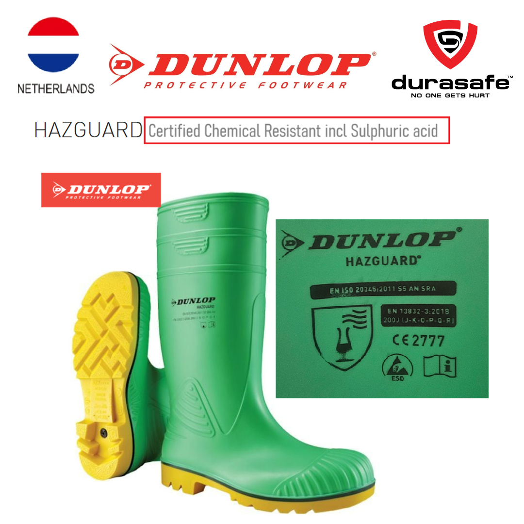 The boots feature a protective toecap and midsole for offering maximum protection against falling and penetrating objects. Tested and certified in accordance with the EN ISO 20345:2011 standard, the built-in protective toecap serves to protect the toes from impacts of an energy level of 200 J and a compression at a load of 15 kN. The protective midsole is positioned in the sole and penetration is prevented until a force of 1100 N. Dunlop boots with a protective toecap and midsole are labelled as Full Safety.