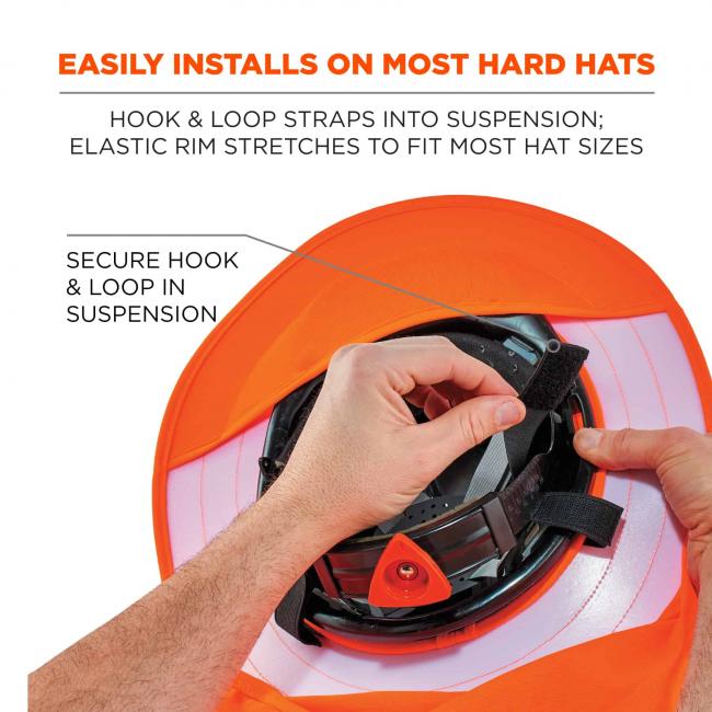 The Chill-Its® 6660 Hard Hat Brim with Neck Shade attaches to hard hats to shade the face and neck for protection against sun damage. This full brim shade fits most hard hats, with an elastic rim plus patented hook & loop attachments for securing to the suspension. A durable plastic ring makes sure the brim holds its shape and a wide panel shade extends down for complete back-of-neck coverage.