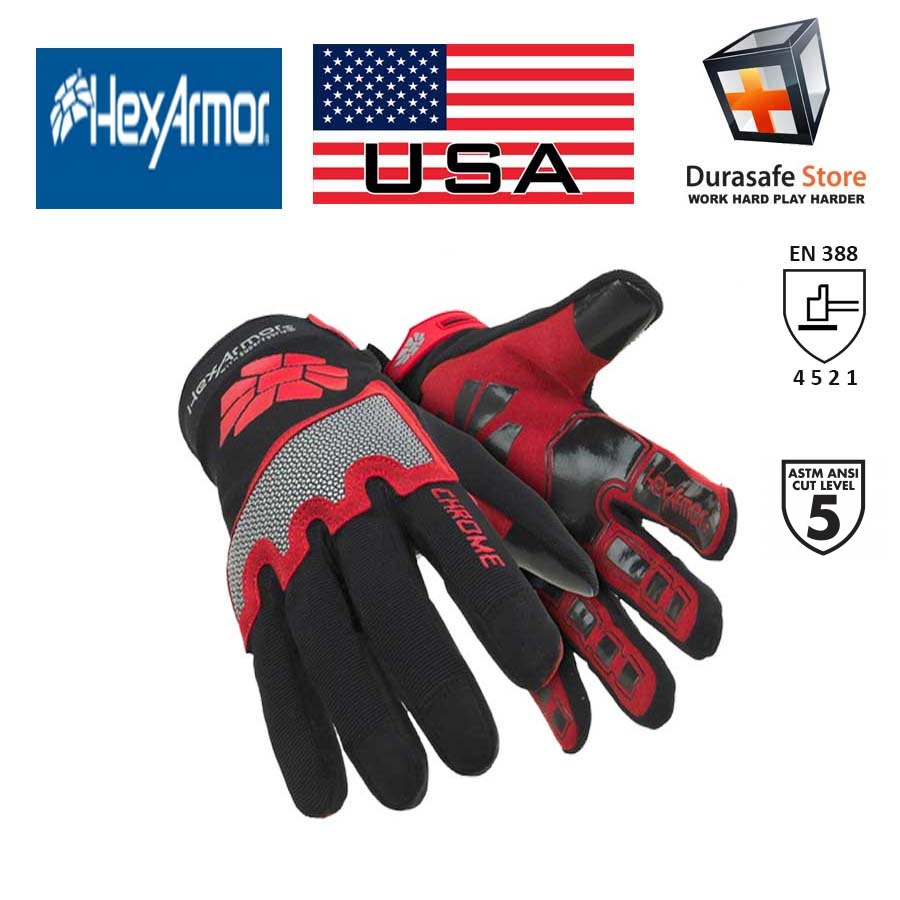 Hexarmor 4022 Chrome Series Cut & Puncture Resistant Mechanics Glove Red, Size M-XL Over 25 times the cut resistance of the mechanics’ gloves you’re wearing right now, and over 10 times the cut resistance of Kevlar®! Sound crazy? Not with the Chrome Series™ from HexArmor. We’ve invested millions of dollars perfecting technology and PPE designs to shatter current ratings for cut and abrasion resistance.