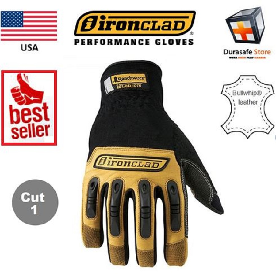 Ironclad Ranchworx Work Gloves handle tough, gnarly jobs in the most abrasive conditions, These gloves are made with top-of-the-line bullwhip® leather and are reinforced with 100% Dupont™ Kevlar® fibers and Duraclad® in critical areas. Patented fingertip and palm designs give you superior dexterity, whether you’re roughing it out on the ranch or working a precision task. Machine-washable leather won’t harden or shrink. Ironclad Ranchworx Work Gloves. Imported.