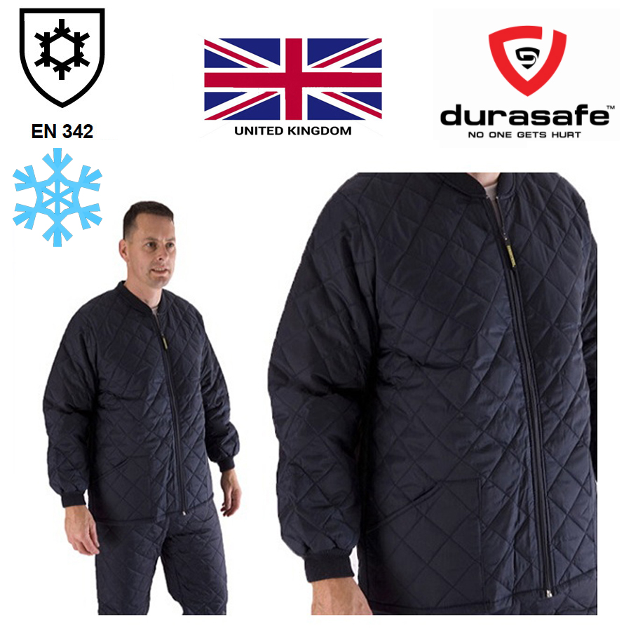 100% Nylon zip front thermal jacket with 2 oz. polyester quilting. 2 open pockets. Knitted cuffs at wrists.