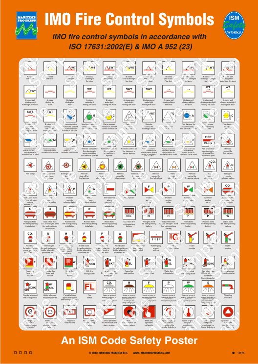 MARITIME PROGRESS – UK 1067WP Safety Poster for IMO Fire Control Symbols 420mmX297mm (impa 331557)Maritime Progress has, for many years, been the market leader in the authorship and production of marine safety awareness and training posters. The range has grown to be the most comprehensive available and each title is vetted by at least one regulatory body prior to publication. Most of the posters are aimed at complementing the ISM code by assisting in safety awareness training. Some of the posters are required by SOLAS Regulations, for example Chapter III Regulation 9 requires posters or signs to be provided in the vicinity of survival craft explaining the use of the craft and their controls.
