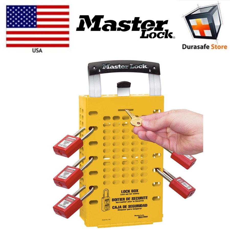 The Master Lock No. 503YLW Latch Tight™ Group Lockout Box, yellow, accepts 14 padlocks or lockout hasps and can be mounted to the wall or carried from job to job. Lock box holds hundreds of keys and includes organized storage for 12 keys in back of box. Also features an exclusive, patented Latch Tight™ locking mechanism that prevents keys from being accessed until the last padlock or hasp is removed from the box.