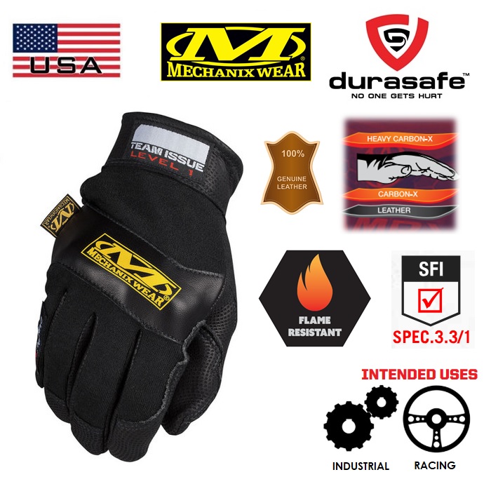 Team Issue Level 1 glove is constructed with a sturdy CarbonX lined genuine leather palm and backed with a comfortable top layer of fire-retardant CarbonX stretch-knit with SFI Level 1 protection. The wide leather cuff allows for easy entry and a fit you can trust when the heat is on. Meets or exceeds SFI 3.3/1 specifications.