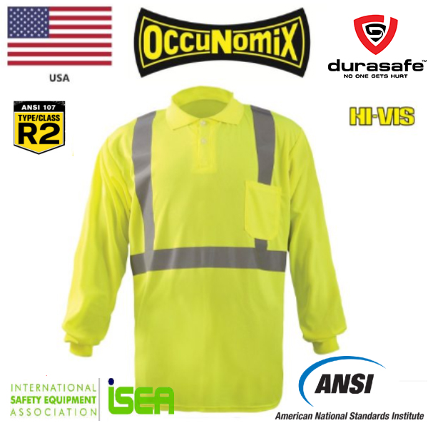 The LUX-LSPP2B by Occunomix is a moisture wicking birdeye, long sleeve Polo T-shirt. Made with 3.8oz moisture wicking birdeye fabric, this polo shirt meets ANSI Class 2 standards with 2’ sliver reflective stretch tape that aligns the garment. A tagless collar will further add comfort. A single chest pocket is located on top of the tape. This hi vis workwear meets ANSI/ISEA 107-2015 Type R. Class 2 standards.