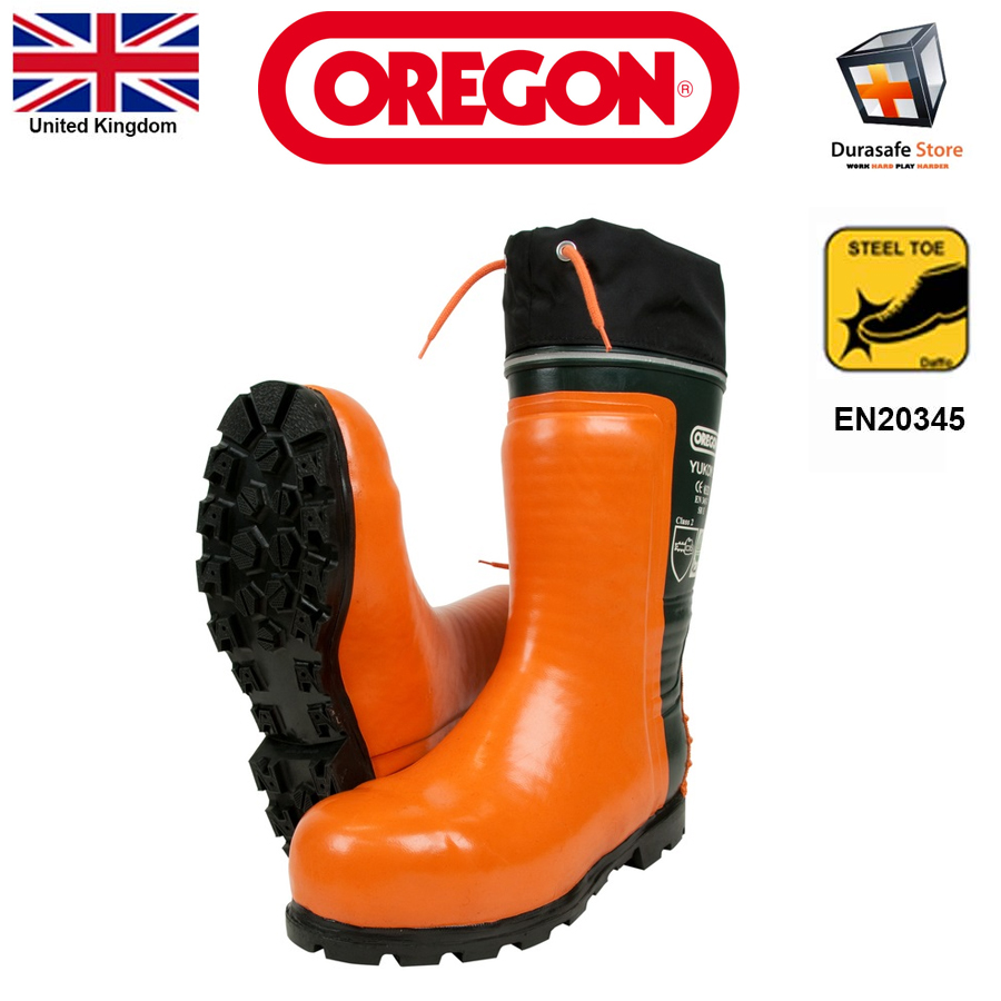 • Oregon Yukon II Chainsaw Safety Boots 70% natural rubber – 30% Styrene Butadiene rubber
