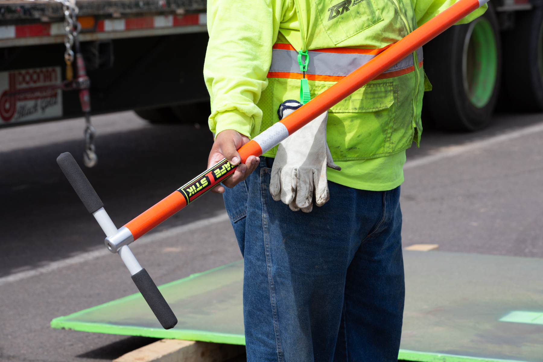 Safe-T-Stik is the ultimate hands free, no-touch magnetic safety tool for moving road plate, trench plate, poles, pipe,