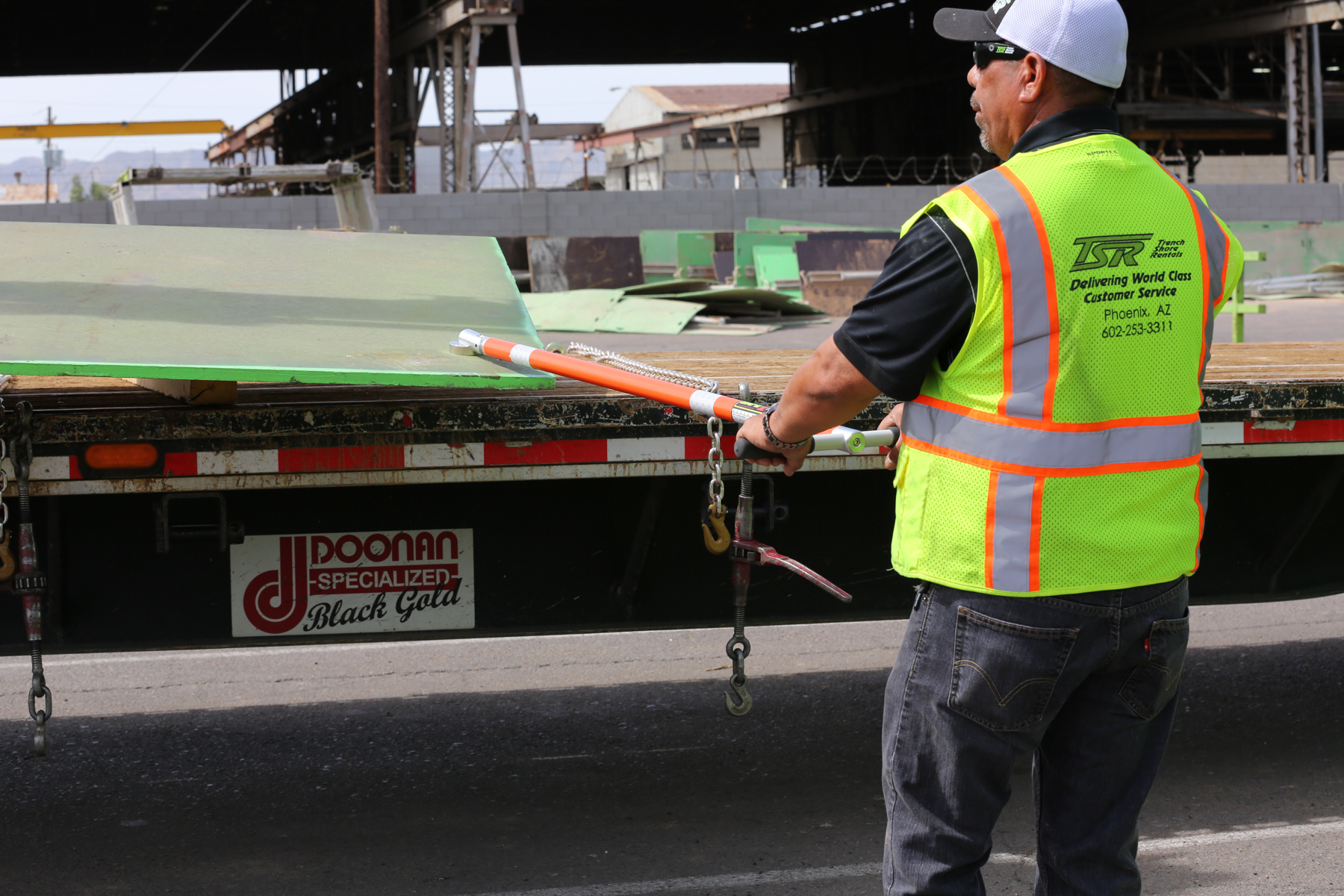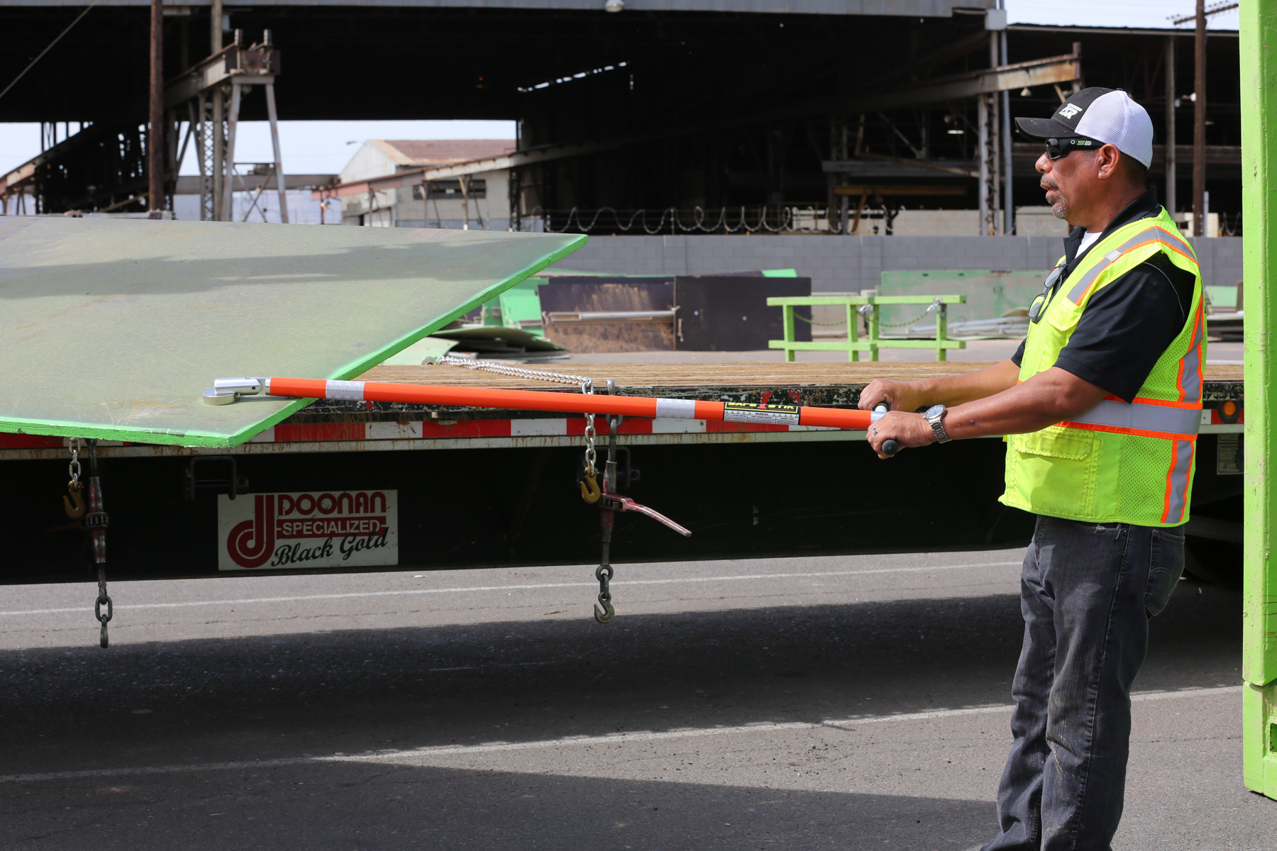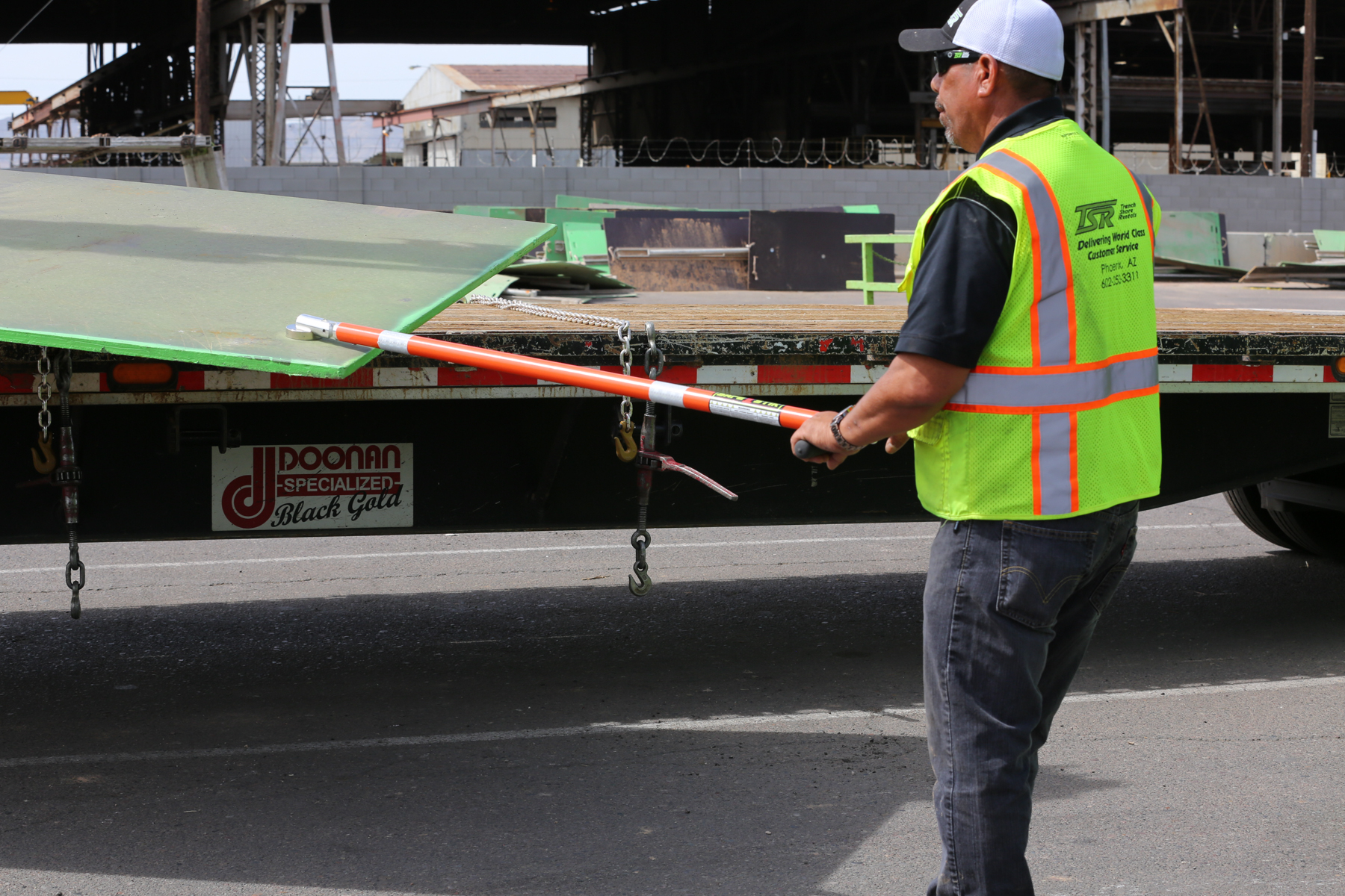 Safe-T-Stik is a magnetic tag line safety tool for moving road plate, trench plate, steel plate, I-Beams, pipe, poles and most any heavy steel object being hoisted or lifted.