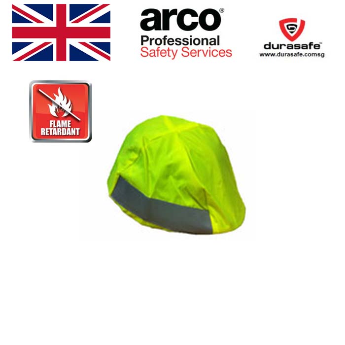 Flame Retardant Helmet Cover in Yellow complete with Silver Tape.