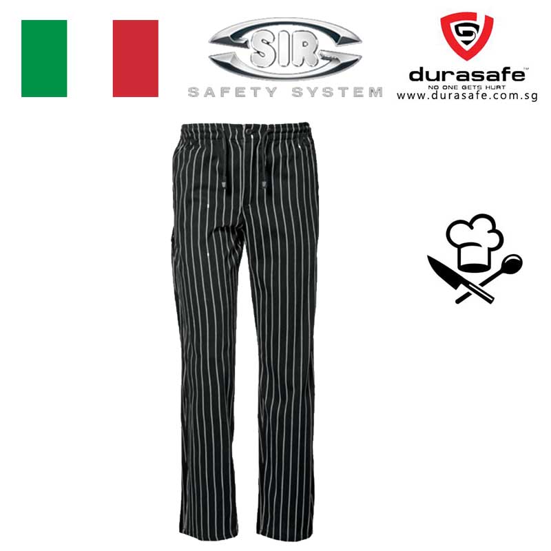 Functional trousers made of 65% polyester and 35% cotton, 190 g/m², with white/black stripes and elastic drawstring on waist; fly with button and zip.