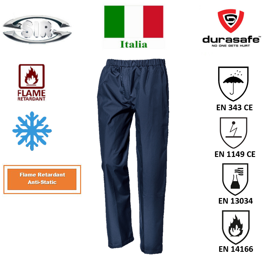 Overpants with antistatic, flame retardant, acid resistant and high visibility properties; Breathable and waterproof, antistatic, resistant to chemical substances, with flame retardant treatment. It features exterior-to-interior access with water resistant zip, front zipper closure and elastic waist