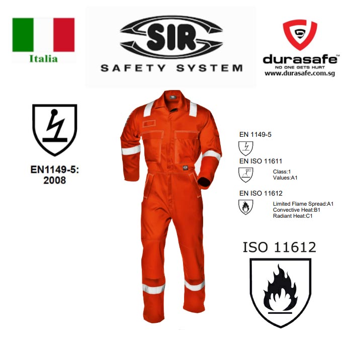 Coverall with shirt collar in 99% cotton, 1% carbon fibre, 230 g/m². twoway central zipper closure with flap and Velcro, chest pockets with zipper