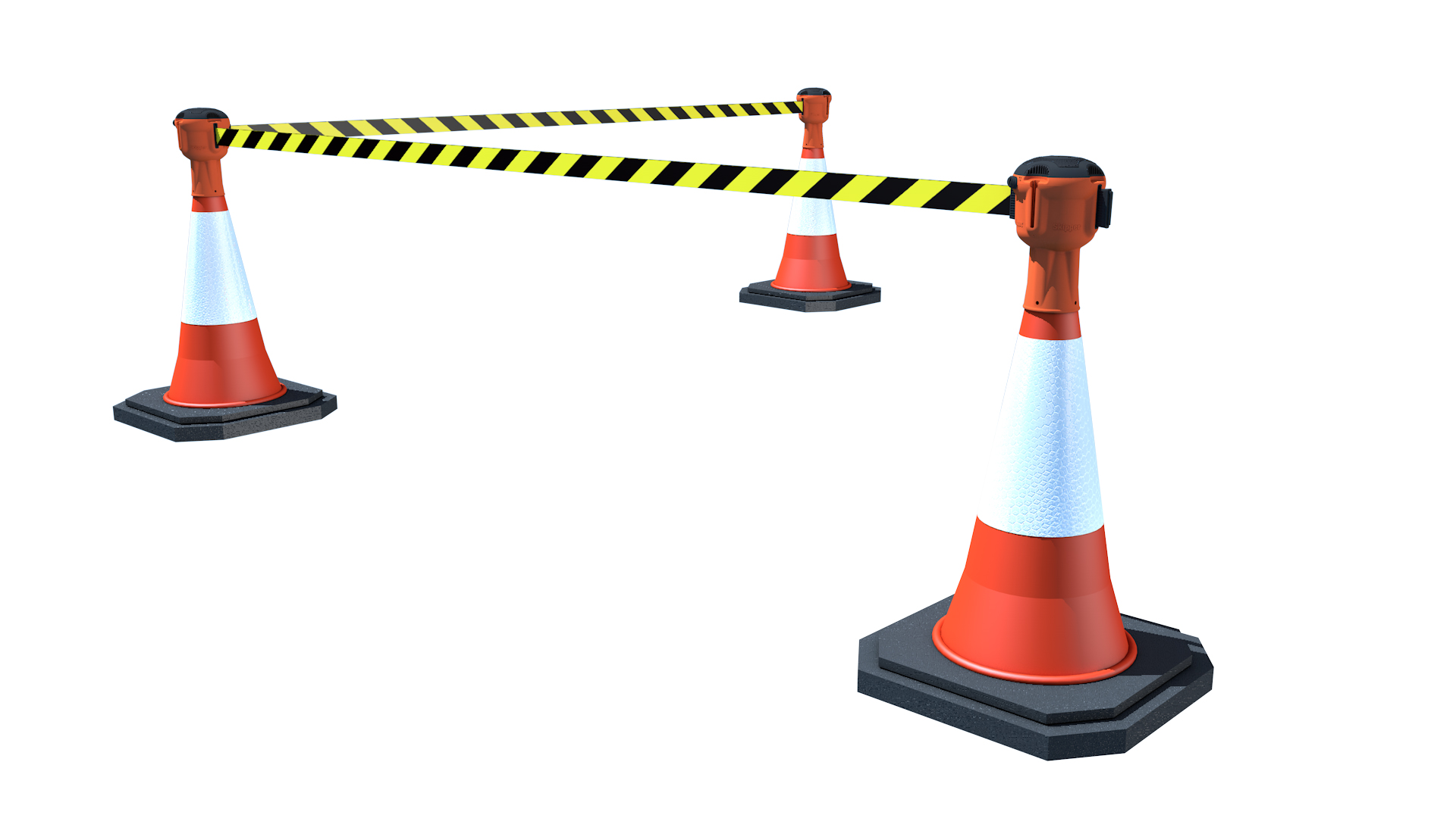 • Retracting heavy-duty tape is securely connected to the next cone, providing up to 9 metres of barrier