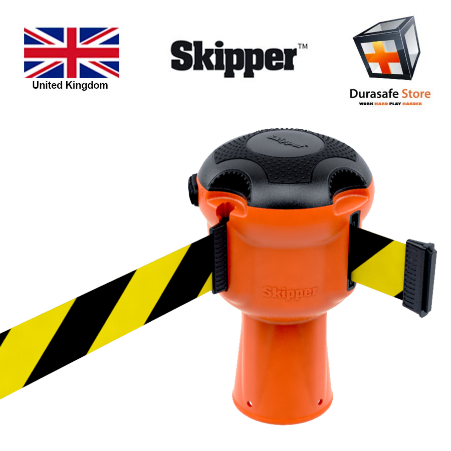 Skipper: the unique way to cordon off any outside area, creating safer environments with high visibility retractable 9m tape. Skipper simply clicks on top of most traffic cones, saving time, storage space and money. It pays for itself in months over throw away barrier tape.
