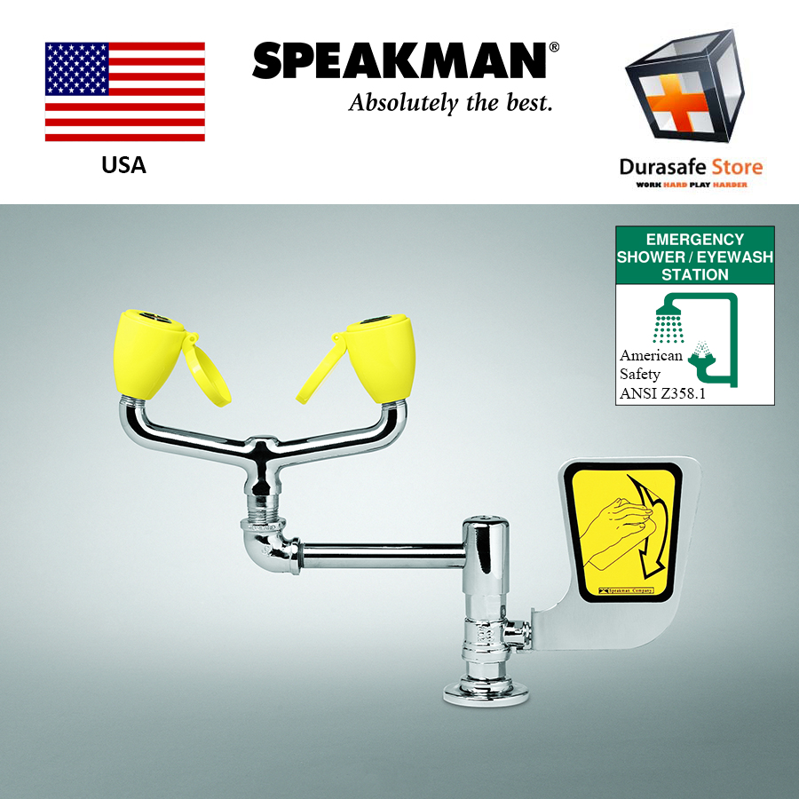 SPEAKMAN – USA Emergency Eyewash SE-572 Deck-Mounted Laboratory Eyewash Twin Outlet is counter top mounted and is designed with two aerated plastic sprays which have automatic flow control. This eyewash is activated by a paddle handle and swivels 90 degrees. The paddle handle is made of stainless steel and the valve is chrome-plated and made of female brass.