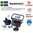 The SR 100 half mask is made of silicone in three sizes, i.e. S/M, M/L and L/XL. The mask is equipped with two exhalation valves, which ensures very low exhalation resistance. The valve covers with partitions effectively protect the exhalation membrane against dust and paint mist. The material and pigment of the mask body are approved by FDA and BGA for foods, which minimizes the risk of contact allergies. The easily adjustable elastic head harness straps of the mask are designed as a V-shaped loop and have a large dished crown plate, which contributes towards a comfortable and safe fit. The mask is used either as a filtering device in combination with filters from the Sundström range, or in combination with the SR 307 compressed air attachment which then serves as a breathing apparatus with continuous flow for connection to a compressed air supply. A pre-filter holder is supplied.
