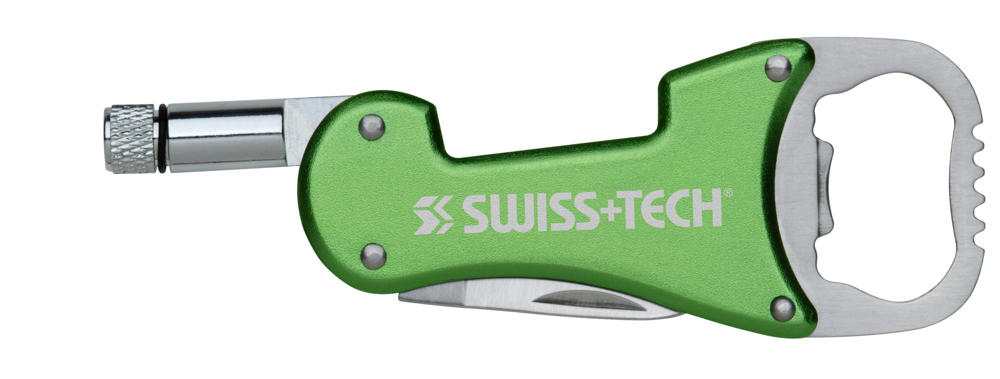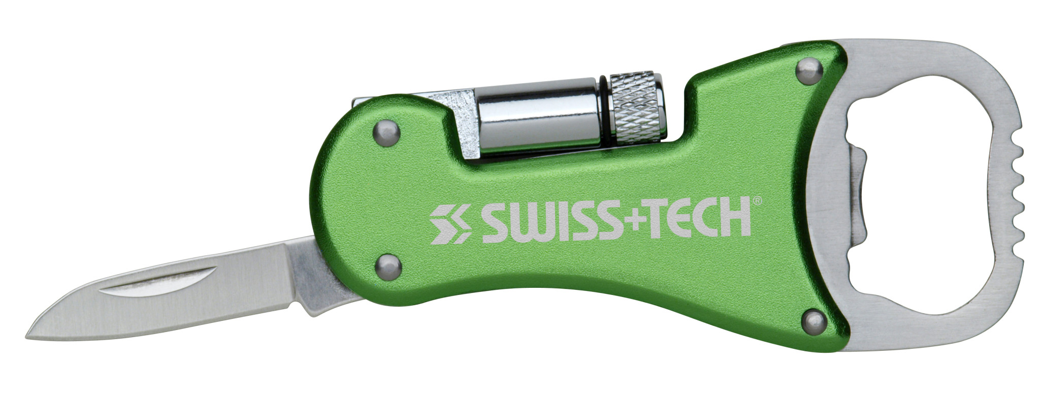 The Bottle Opener Multi-Tool contains a heavy-duty bottle opener with a serrated edge. A straight edge knife and LED flashlight fold out from the steel and aluminum body. Metallic green finish. Batteries included.
