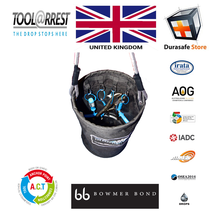 Secure your tools in bucket. • Heavy duty nylon • Swivel snap hook • 8 internal karabiners to secure tools in-waiting and internal draw string pouch • Plastic bottom • Rugged, tested and large enough for multiple tools / applications • Rated for tools up to 34kg