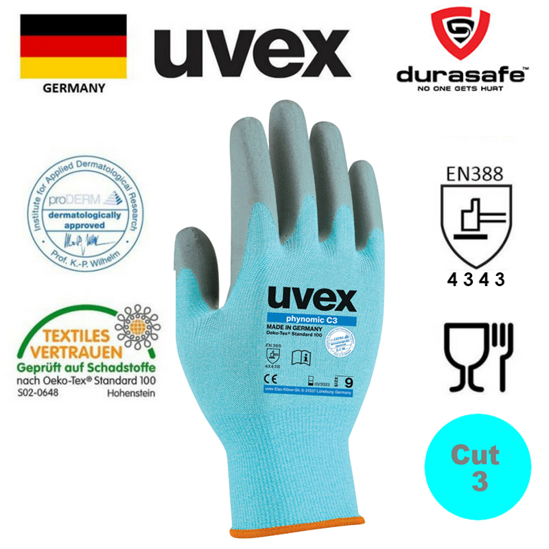 The uvex phynomic C3 is an ultralight all-round safety glove with a good cut protection (Cut 3). The aqua-polymer foam coating is moisture repellent and extremely flexible. The gloves are accelerator free and suitable for allergy
